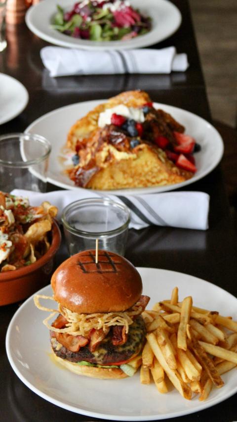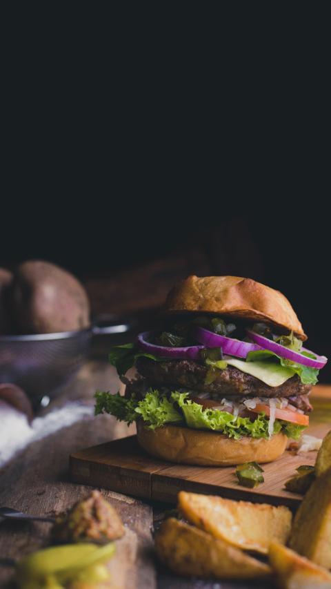 Ensalada de verduras, hamburguesa de ternera y helado de mango